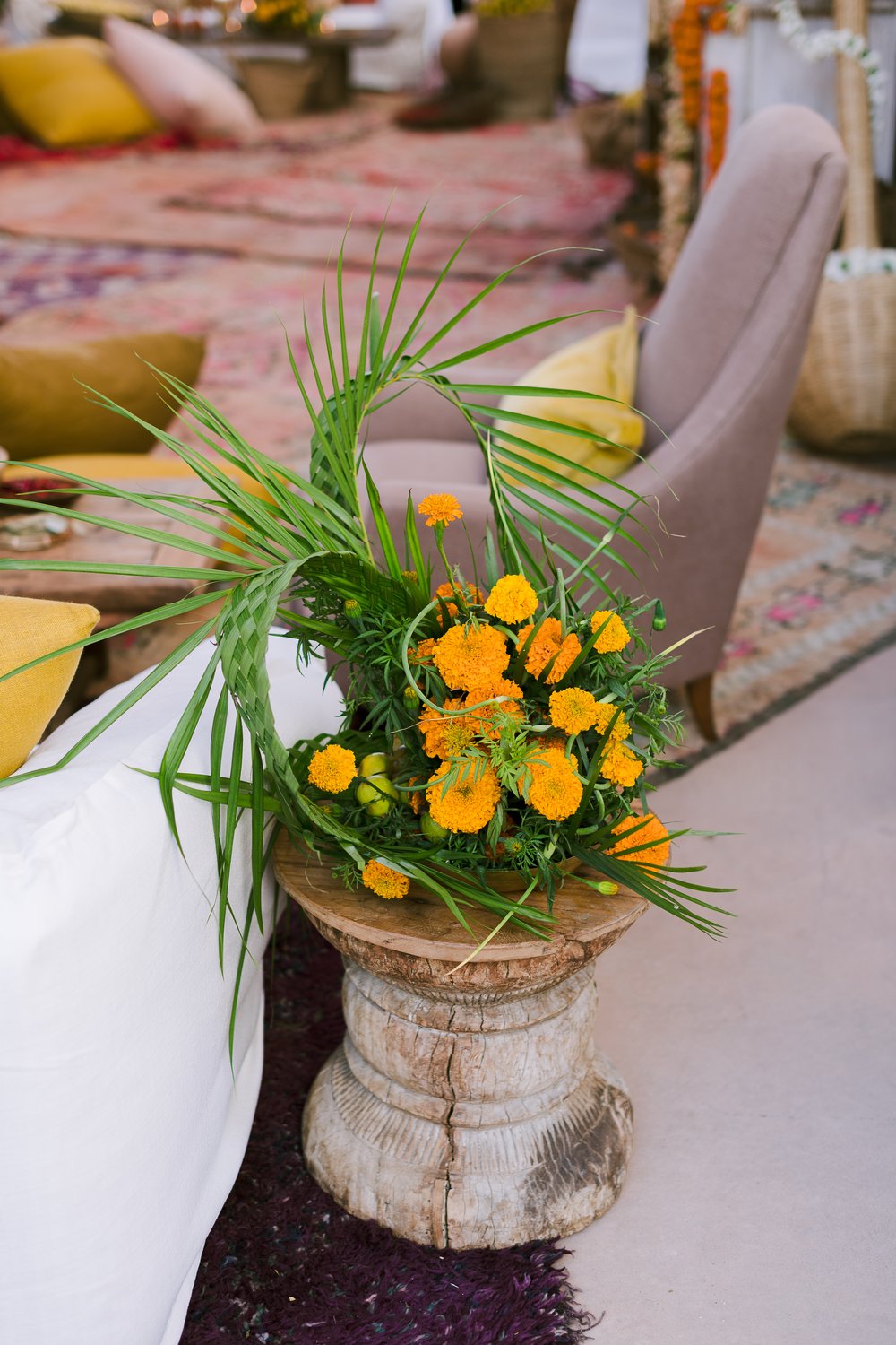 Garlands of carnations and marigolds draped across walls and cascaded out of baskets throughout the entire reception.